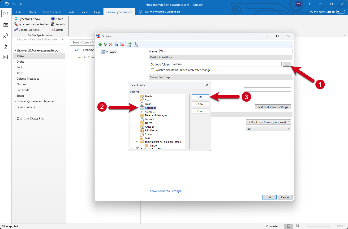 Click the “…” button next to the Outlook folder field to browse and choose where in Outlook the calendar should sync. For example, select the Calendar folder under your Outlook data file or your Exchange profile.