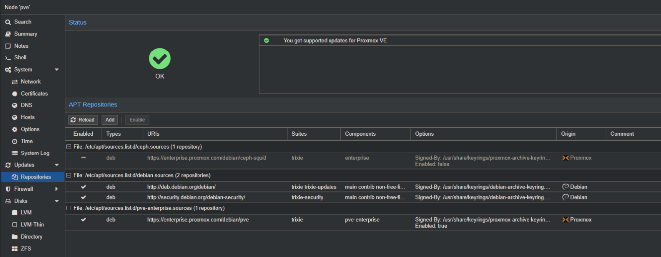 By default, Proxmox VE uses the enterprise repository, which requires a subscription. If you don’t have a subscription, you can enable the no-subscription repository to receive updates. Additionally, it is recommended to disable the Ceph repository unless you are actively using Ceph storage. This guide explains how to do it through the Proxmox VE web interface (GUI).